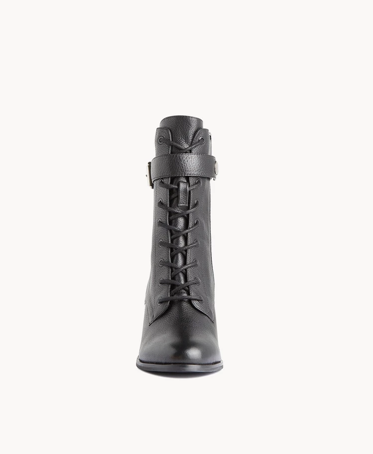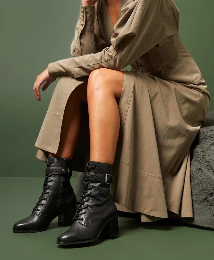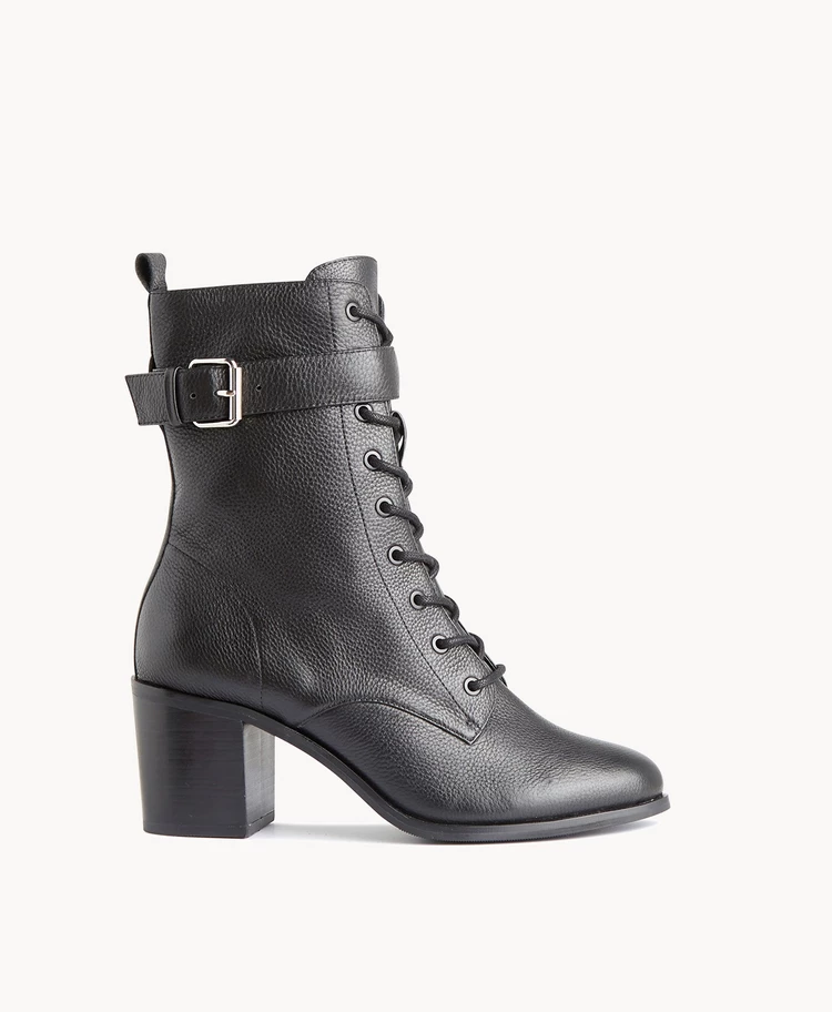 Our Alant biker boot is ideal for Autumnal dressing, paired with tailored woollen skirts and oversized knits. Atlant has an almond toe, high- top laces and a removable buckled ankle strap. The 7.5cm block heel and side zip add to her wearability.