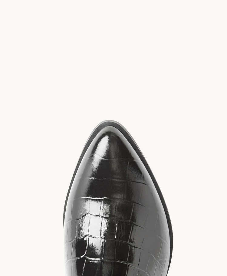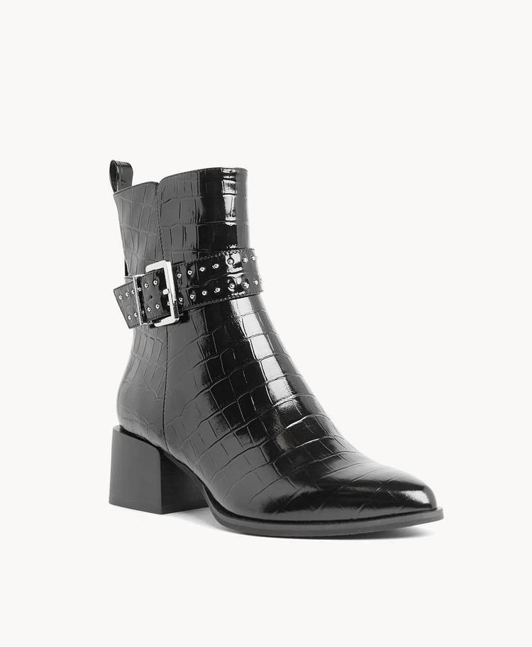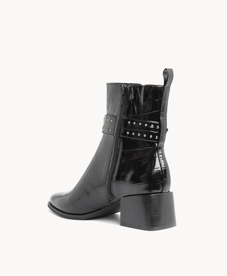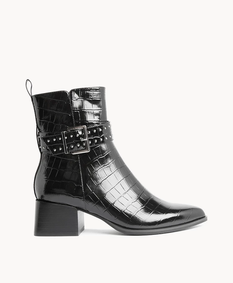 Our Blake ankle boot is sleek and sophisticated set in croc-effect leather, the whole look is tied together with a studded buckle strap. Set on a mid-height block heel, Blake is perfect for moody day to night winter wear.