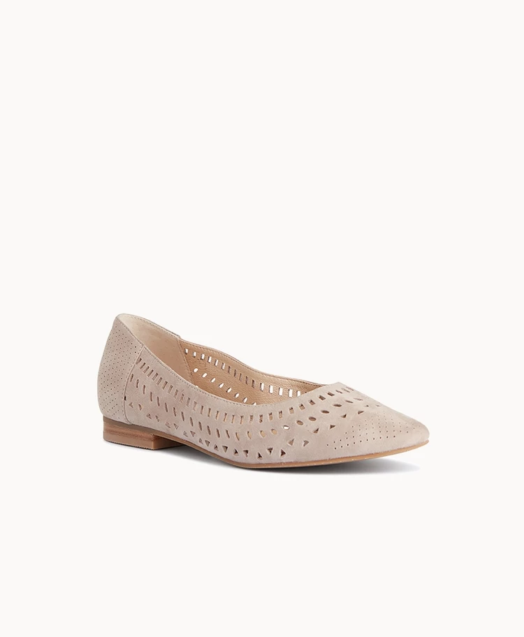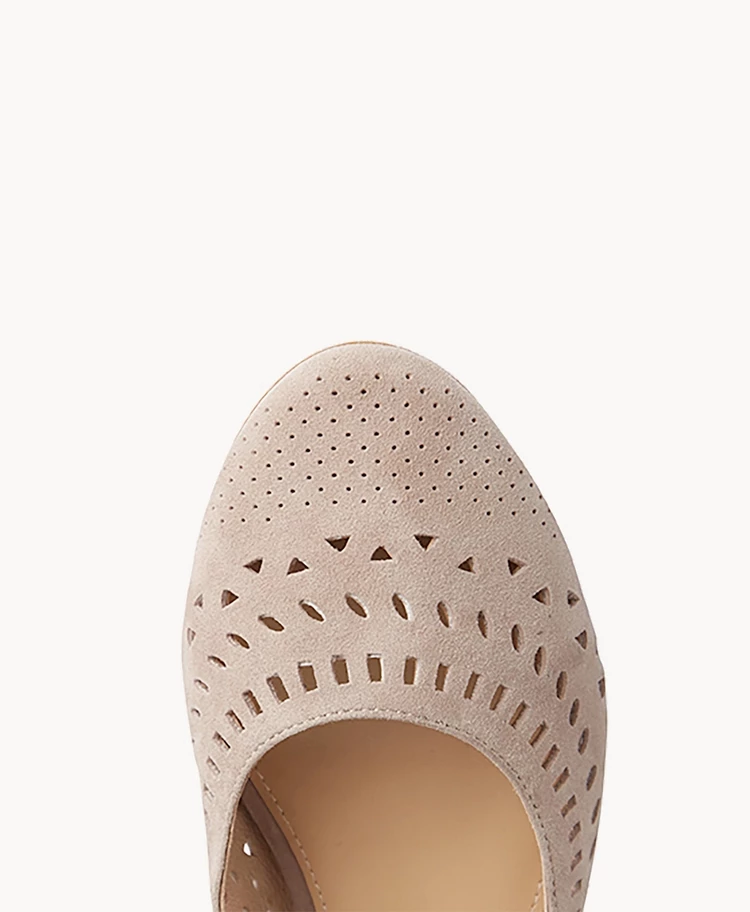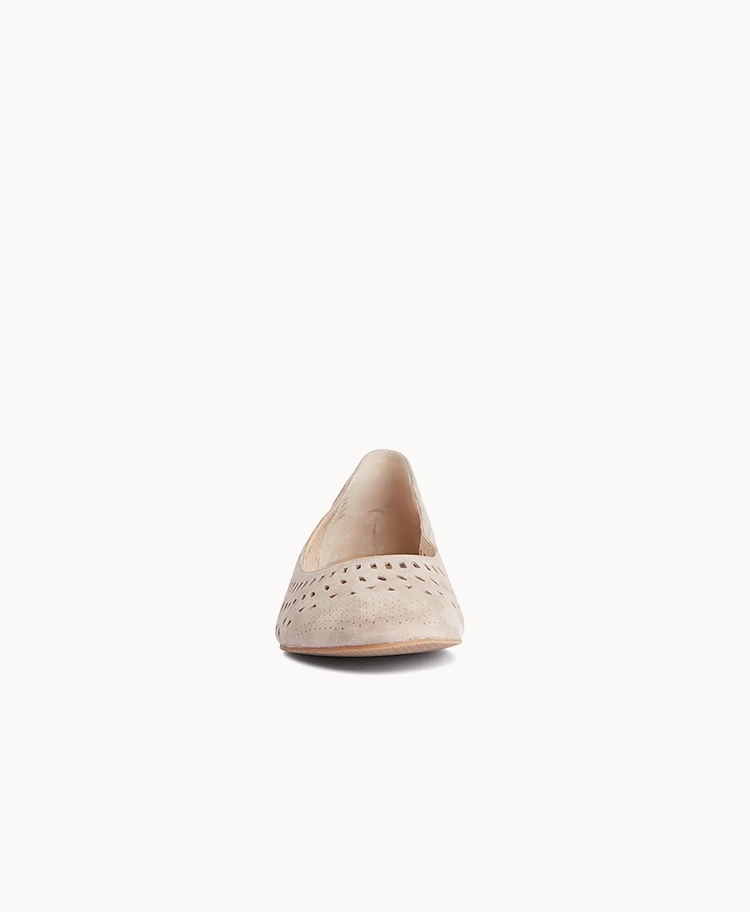 This kid suede ballet flat, perorated for summer wear, is both flexible and versatile,and perfect for dressing up or down.