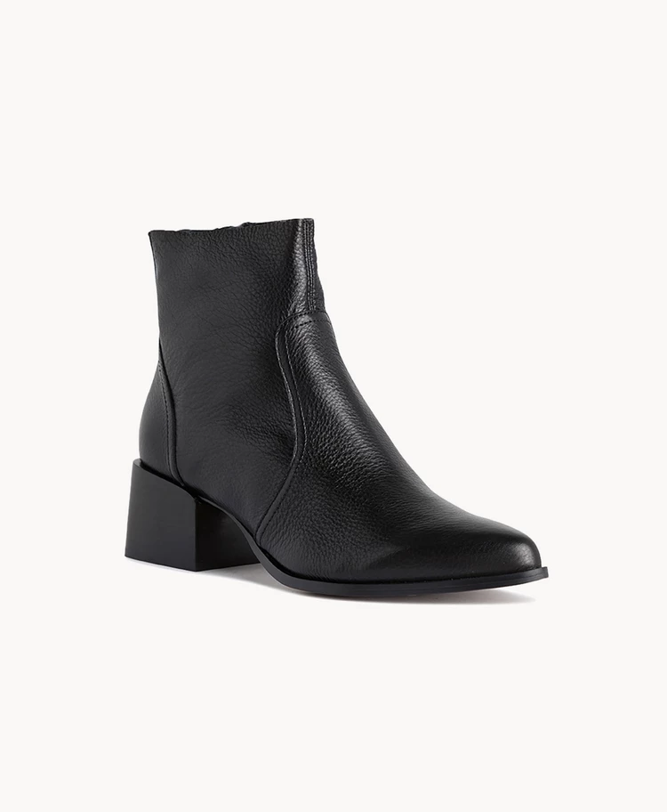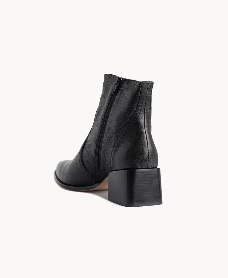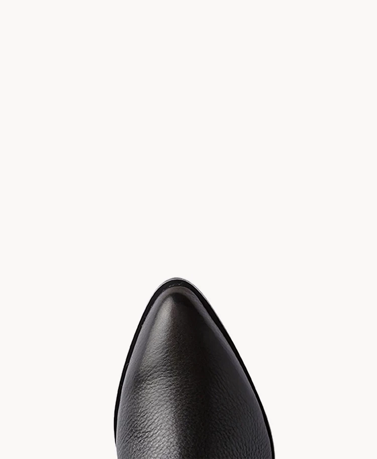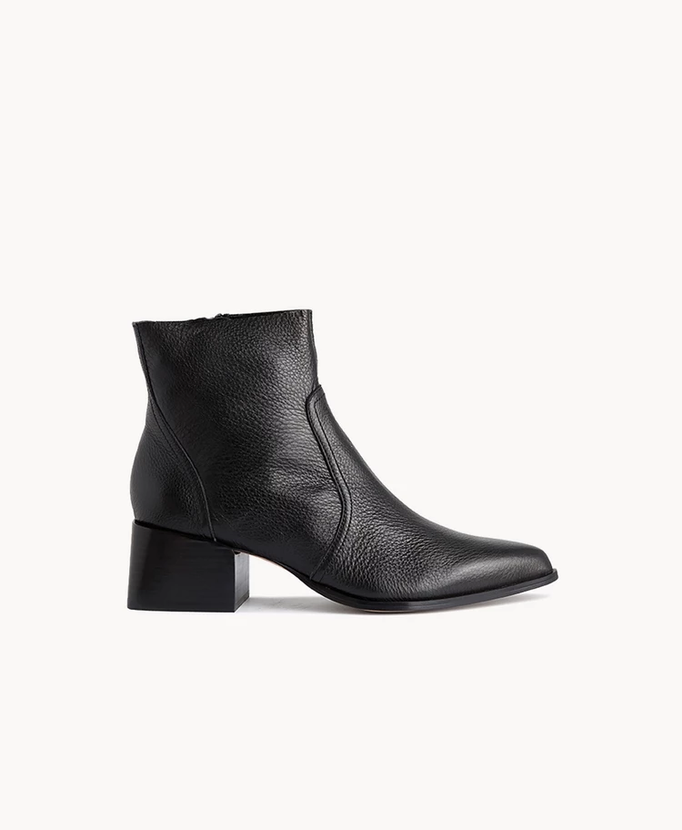 Our Brynn Black boot has a dramatic block heel and long almond shaped toe. Cutting just above the ankle with an