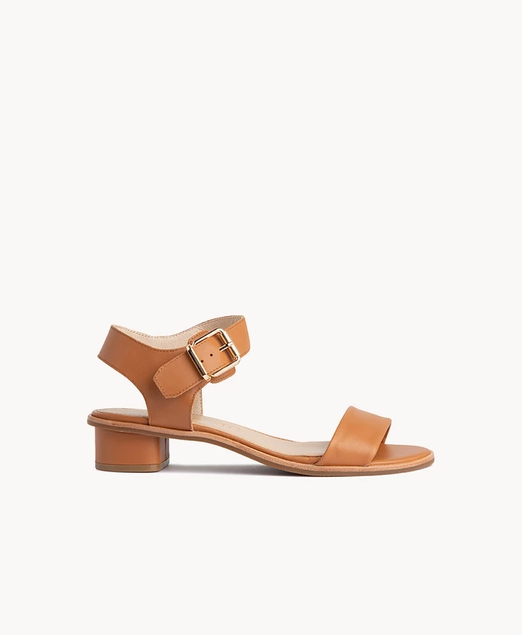 These sandals are one of our bestselling designs – they’re flattering, trans seasonal and versatile. They have a classic leather upper with a buckle fastening ankle strap, and a low leather-wrapped block heel.