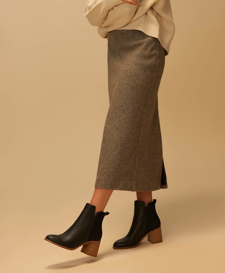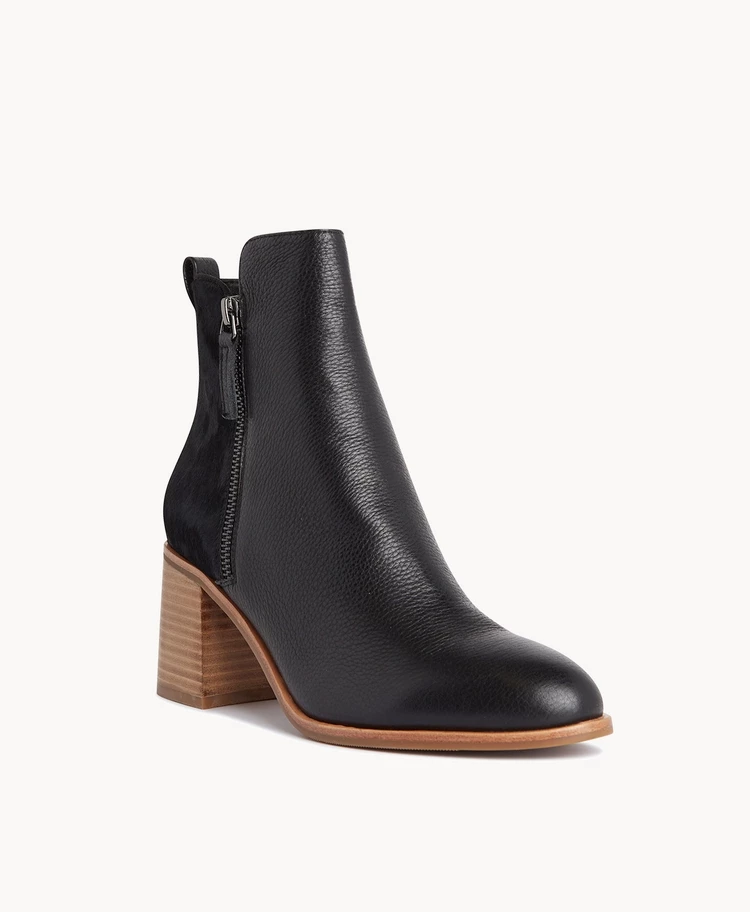 Our Fiona ankle boot is set on a square block heel, with a hair-on leather back panel that really elevates the look. Pair these with your favourite tailored pants for a dressy day to night look.