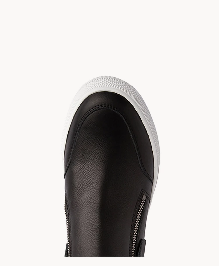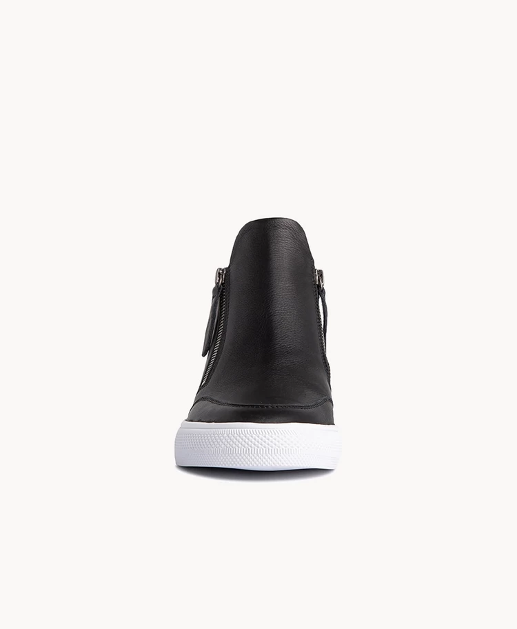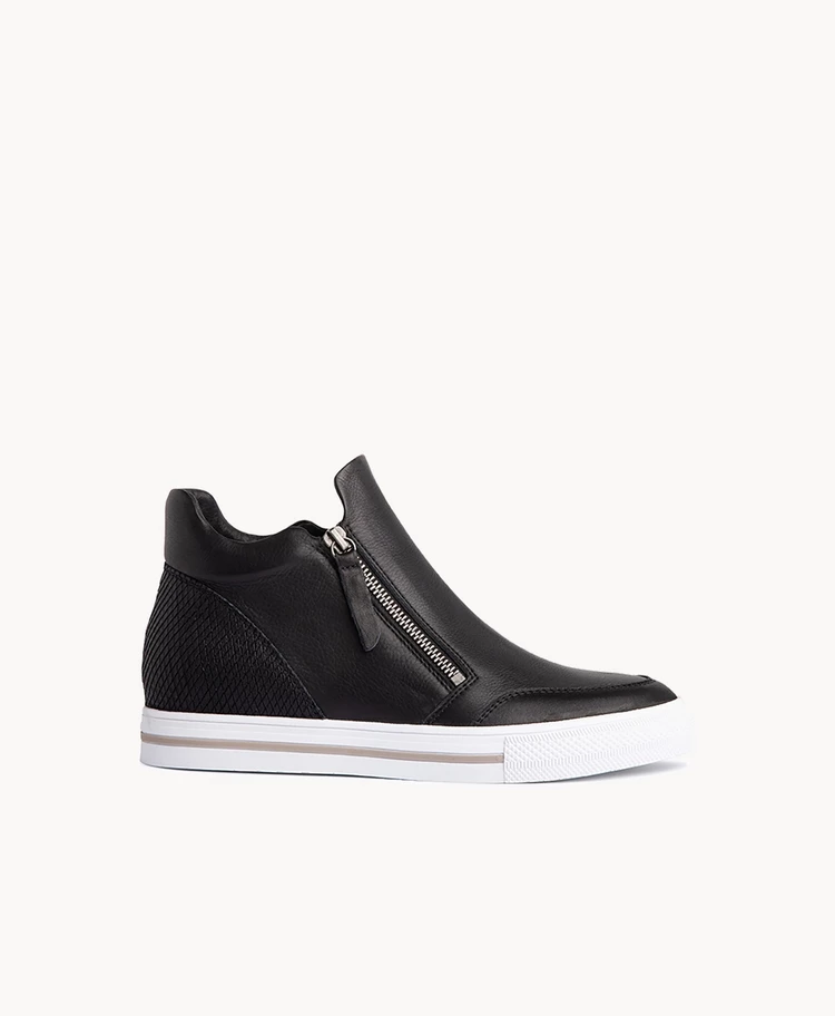 Our Kimberly hightop sneaker features an internal wedge and functional side zippers. Kimberley offers sleek styling that will add an edge to any outfit. Show these off in a midi skirt or cropped jeans.