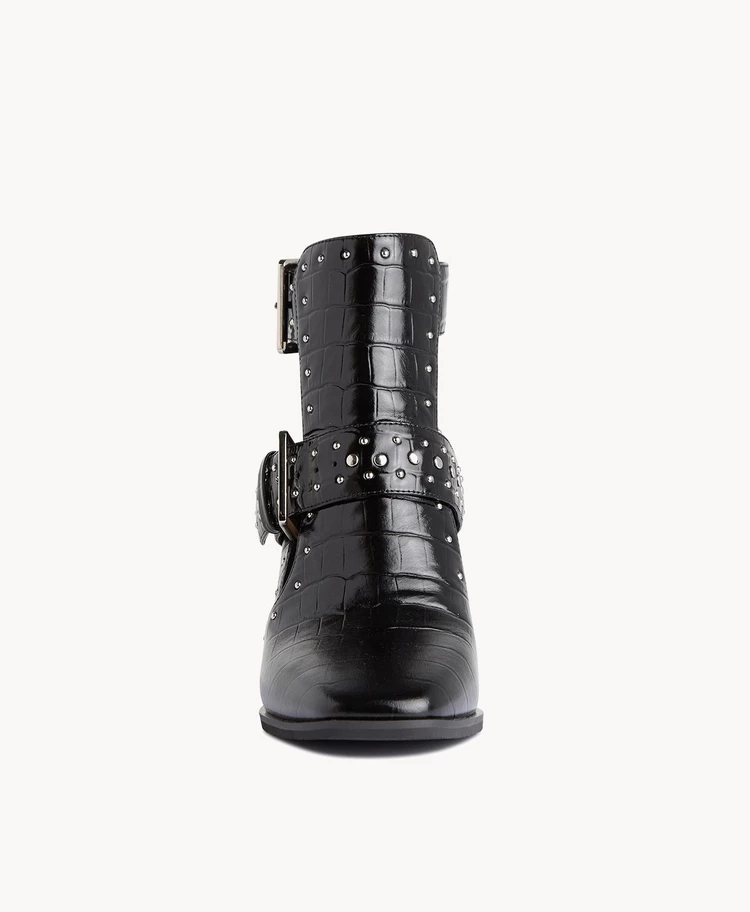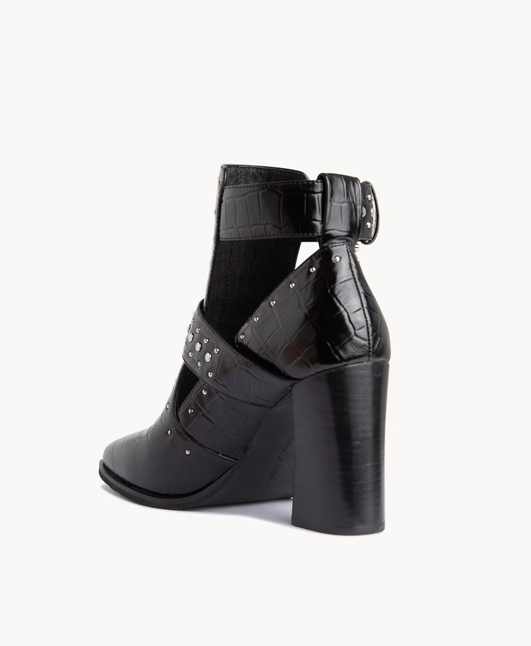 Our Montana heel is boldly styled in croc embossed leather with a flared bock heel for dramatic effect. The cut-out upper is fastened with two wide buckle straps, traced with metallic studding. Pair yours with flowing dresses or cropped trousers.