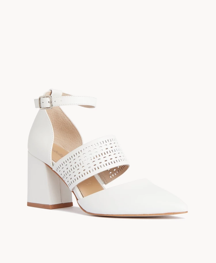 Fresh and feminine, our Sunny heel has a wide laser cut strap and block heel for maximum comfort. Wear yours with midi skirts and shorts to show off the intricate detail.