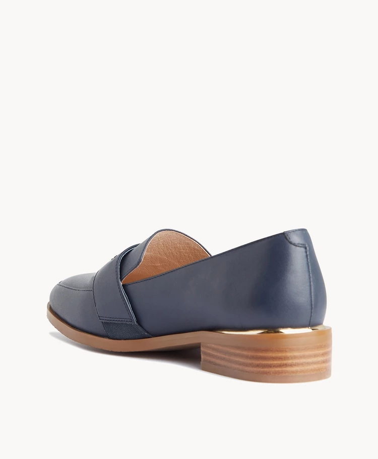 Our Theo loafer feels dressy and understated – perfect for tailored workwear or smart weekend looks. The leather stacked heel adds a subtle lift and has a metallic plate insert that we love.