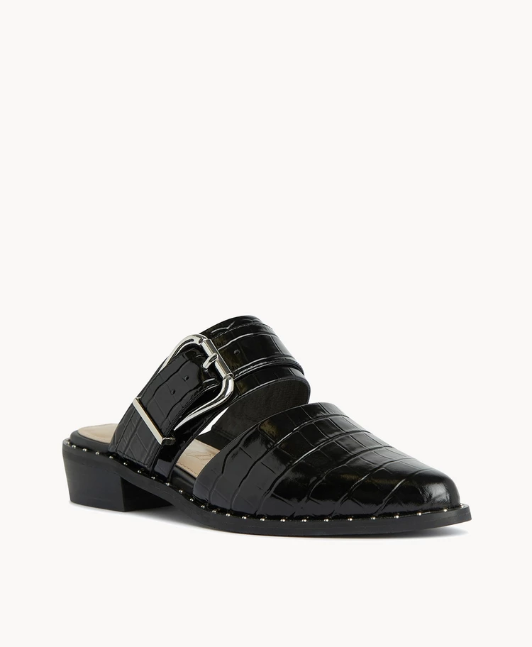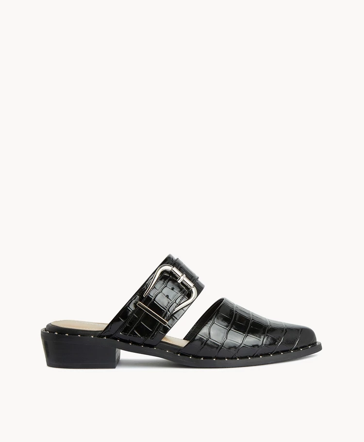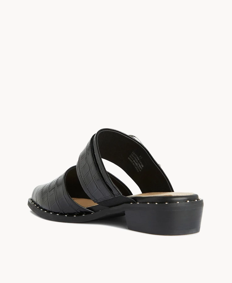 Subtle stud detailing pairs perfectly with the hardware of the Whisper mule’s buckle. An almond shape toe elongates and elevates this simple silhouette, for a look that’s as suited to summer soirees as the boardroom.